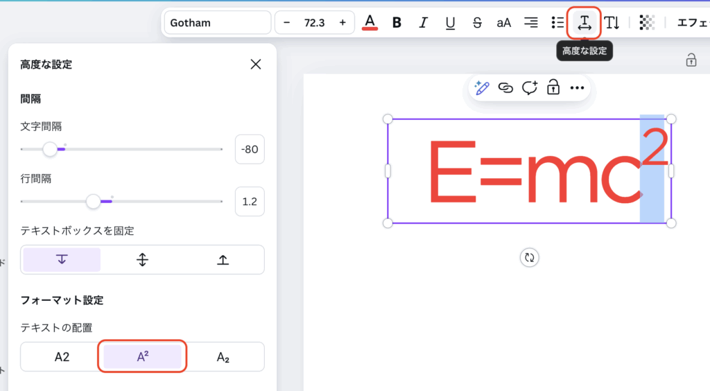 使用方法は、使いたい場所をドラッグして指定し、フローティングツールバーで「高度な設定」を選びます。