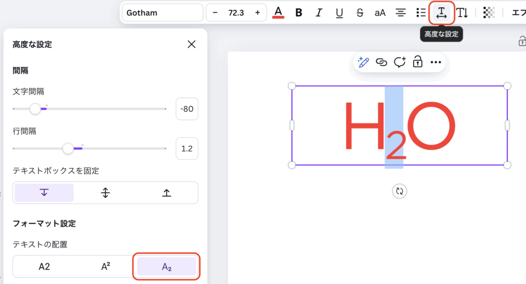 パネル内の「テキストの配置」から「下付き文字」を選びます。