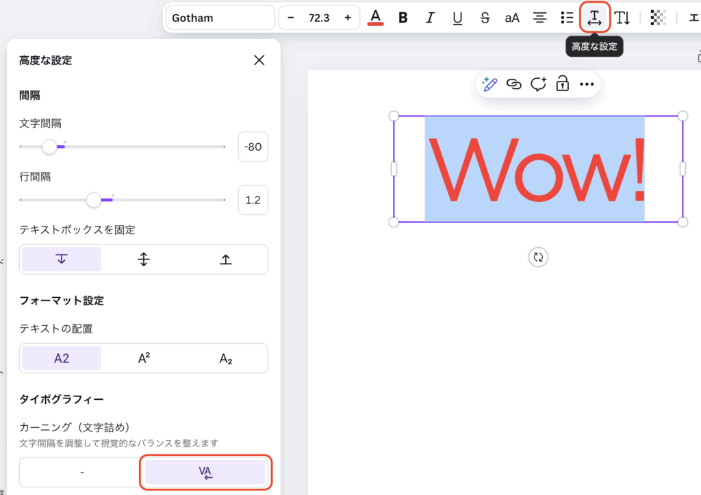 パネル内の「カーニング(文字詰め)」から右側のボタン(「VA←」とついているボタン)を選びます。