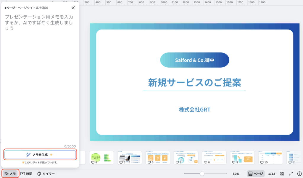 メモのパネルが開いたら、下部の「メモを生成」をクリックするだけです。