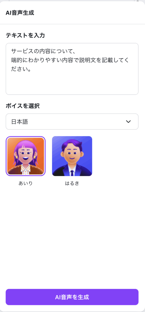 すると左側にパネルが表示されるので、「あいり」(女性の声)か「はるき」(男性の声)を選択し、「AI音声を生成」をクリックします。