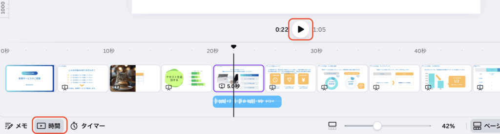 左下の「時間」ボタンを押すと、デザイン中央あたりに再生ボタンが表示されるので、再生ボタンをクリックして音声を確認します。