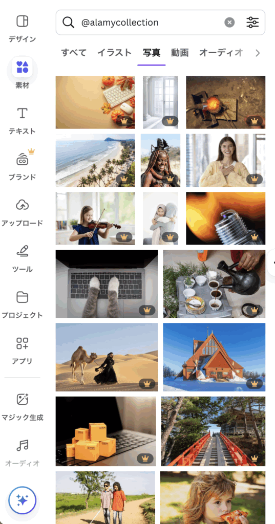 デザイン編集画面で素材パネルを開き、「@alamycollection」と検索するとAlamyコレクションが見れますので、美しい写真を使ってみてください。