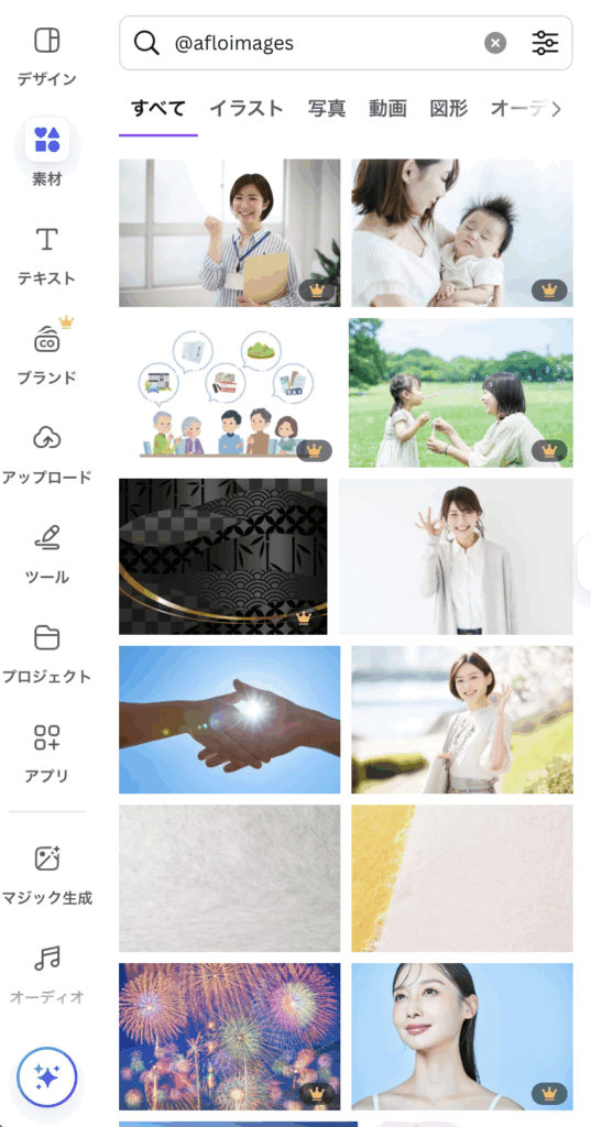 デザイン編集画面で素材パネルを開き、「@afloimages」と検索するとAfloコレクションが見れますので、多彩な写真を使ってみてください。