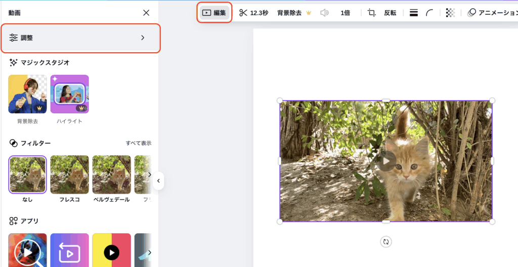 編集パネルが開いたら、上部の「調整」をクリックします。