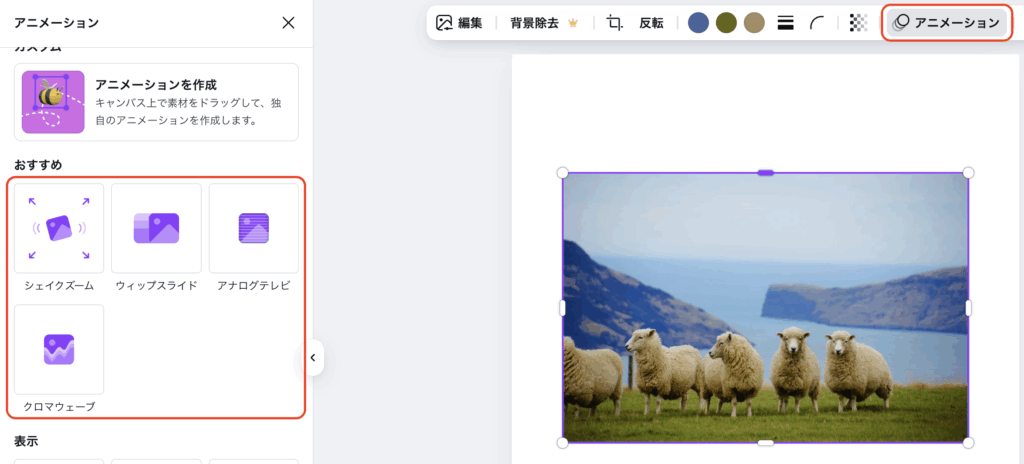 使い方は、フローティングツールバーの「アニメーション」をクリックします。