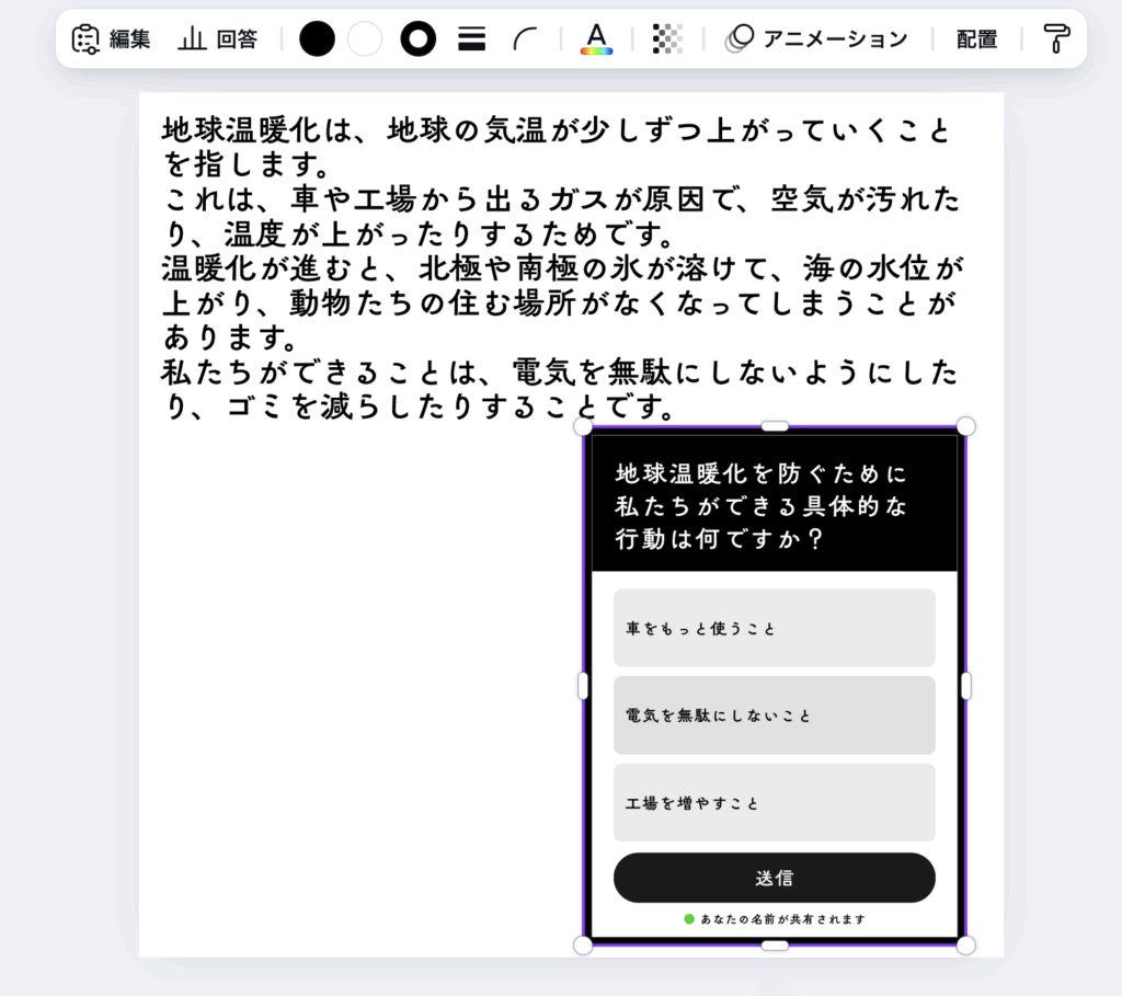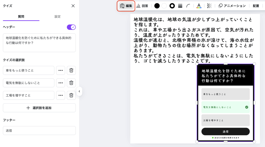 できたクイズは、フローティングツールバーから編集することができます。