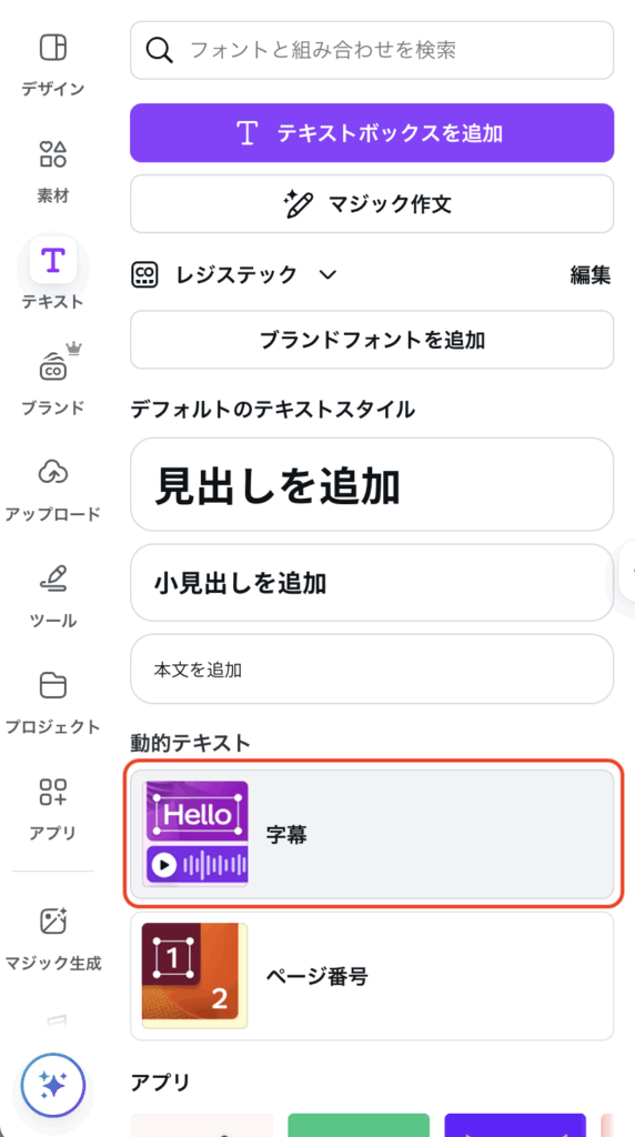 テキストパネルから「字幕」をクリックします。