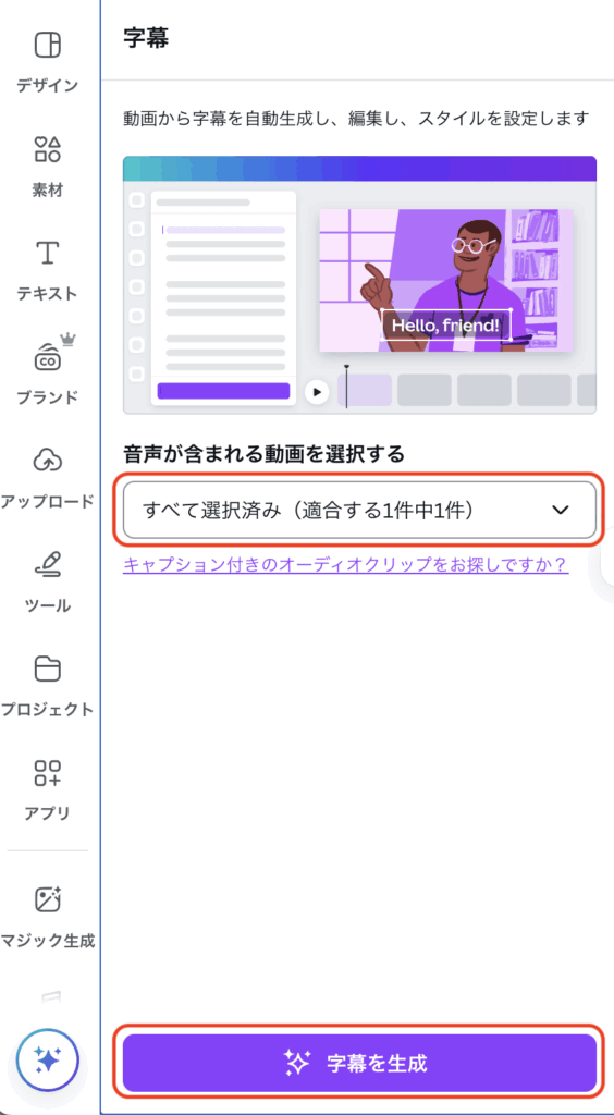 どの動画に字幕をつけるかを選択し、下部の「字幕を選択」をクリックします。