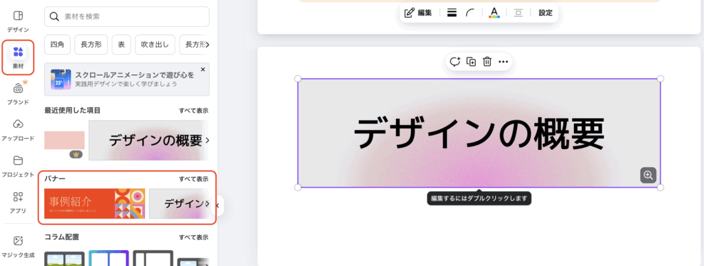 使い方は、ドキュメントのデザイン編集画面で、素材パネルを開くとバナーが表示されます。