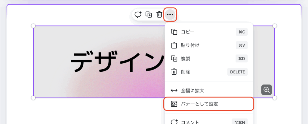 ポップアップツールバーに表示される3つのドットアイコンをクリックし、ドロップダウンから「バナーとして設定」をクリックしてバナーを設定することができます。