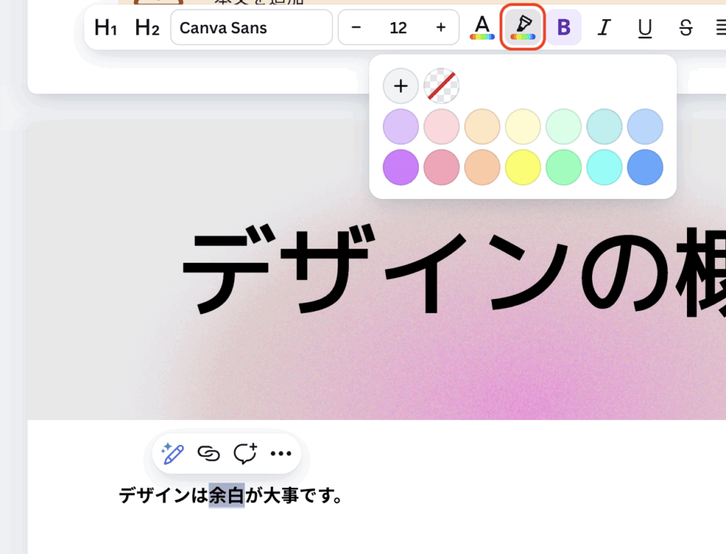 フローティングツールバーの「ハイライト」をクリックし、お好みのカラーをクリックします。